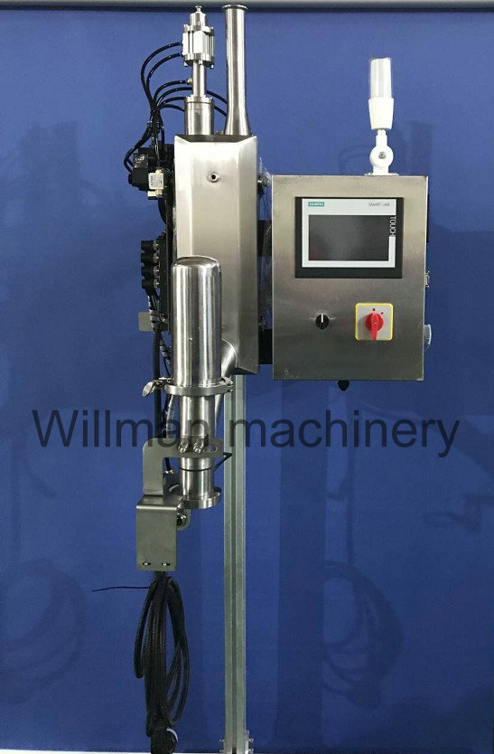 液氮加注机包括固定座、设有进液口和出液口并与固定座固定连接的保温储存筒、保温加注头、两端分别与出液口和保温加注头连接的保温输液管。液氮加注机使用时,进液口与真空液氮输送管道连接,需要加注液氮时,保温储存筒经保温输液管通过保温加注头将液氮加注入铝罐中;液氮加注机也可以用于其他食品软包装的液氮加注。并且液氮加注机结构紧凑用于非碳酸饮料铝罐液氮加注操作方便和液氮纯液相质量较好。